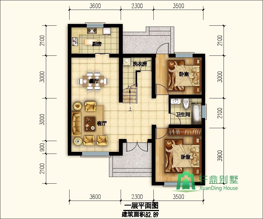 一層:客廳、廚房、餐廳、臥室2、衛(wèi)生間、洗衣房。