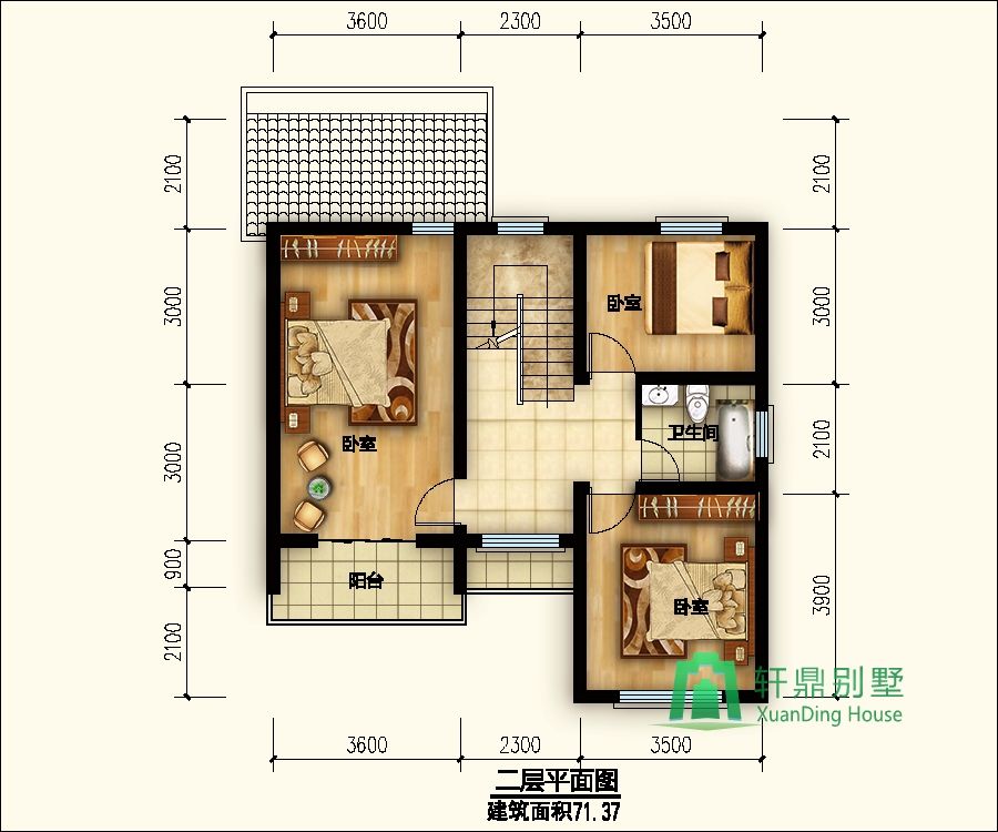 二層:臥室2、衛(wèi)生間、臥室(帶陽臺)。