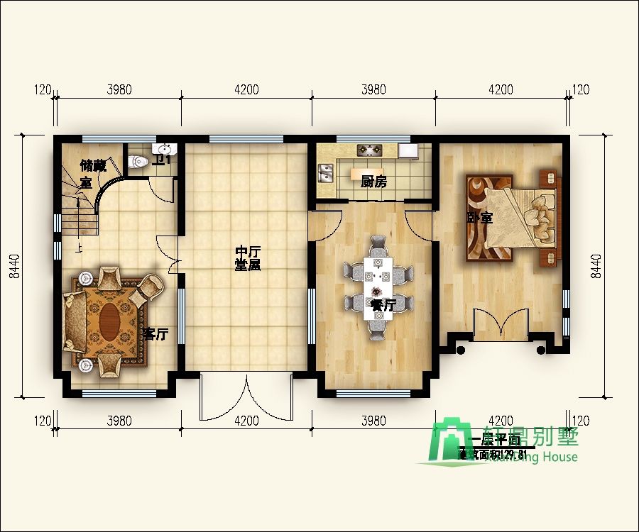 一層:客廳、衛(wèi)生間、儲藏室、廚房、餐廳、臥室。