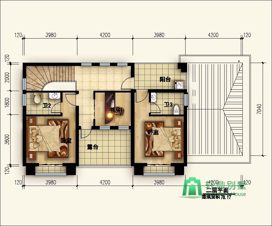 二層:陽臺、露臺、書房、臥室2(帶衛(wèi)生間、書房)。