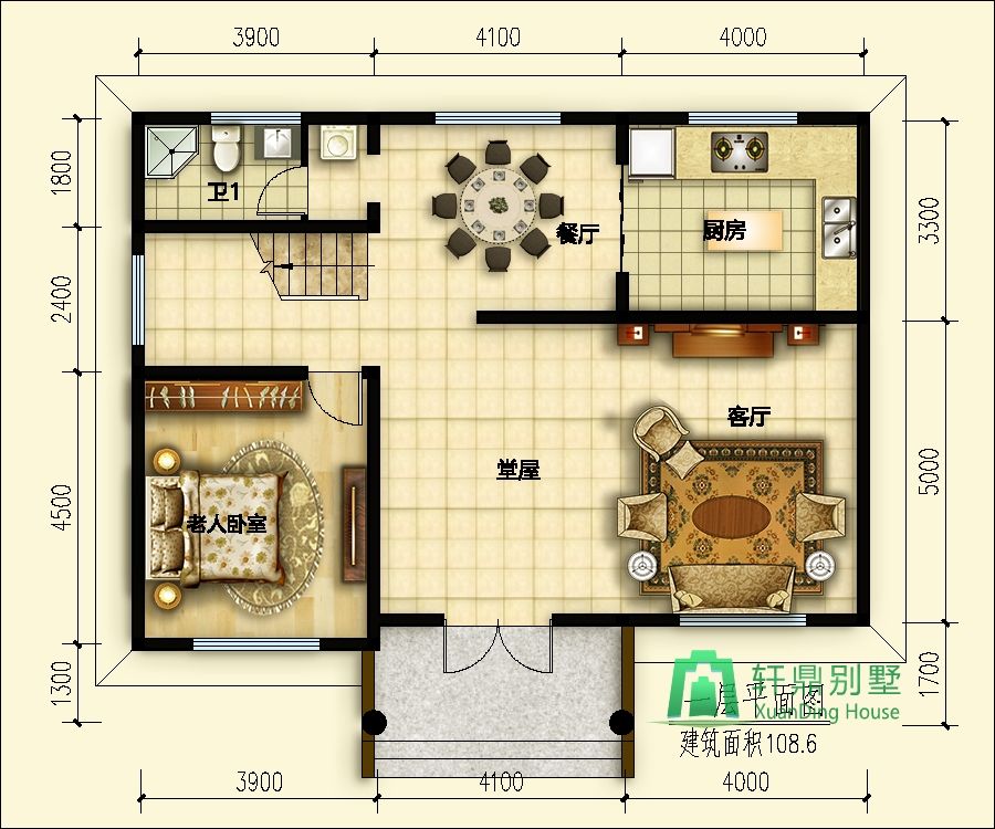 一層:堂屋、客廳、廚房、餐廳、臥室、衛(wèi)生間。