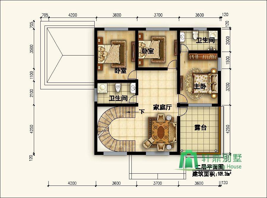 二層:家庭廳、臥室2、衛(wèi)生間、主臥(帶衛(wèi)生間)。