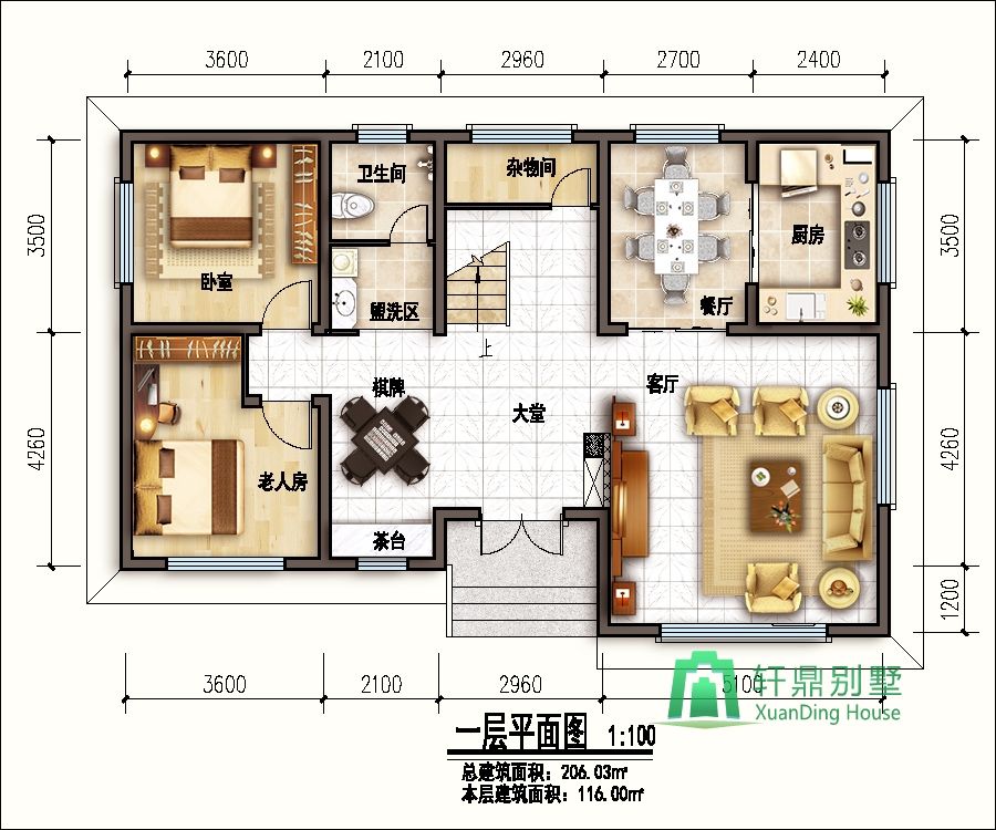樓層層高:一層層高3.6米,二層層高3.3米。