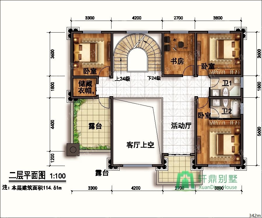 樓層層高:一層層高3.6米,二層層高3.3米。