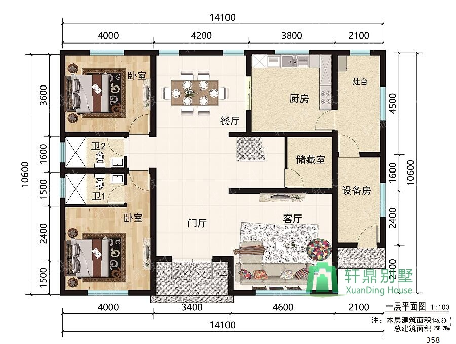 建筑層數(shù):地上2層,建筑總高度(到屋脊高度):9.602米,建筑面積:258.28平方米。