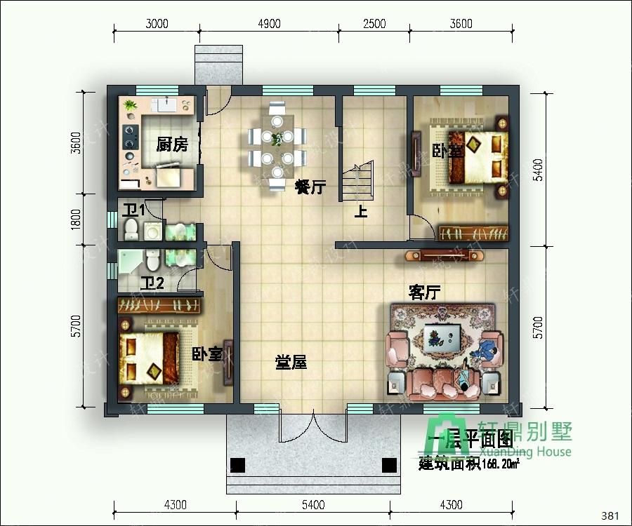 樓層層高:一層層高3.6米,二層層高3.3米。