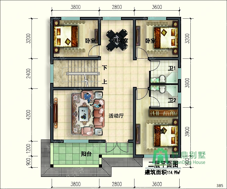 樓層層高:一層層高3.8米,二層層高3.3米。