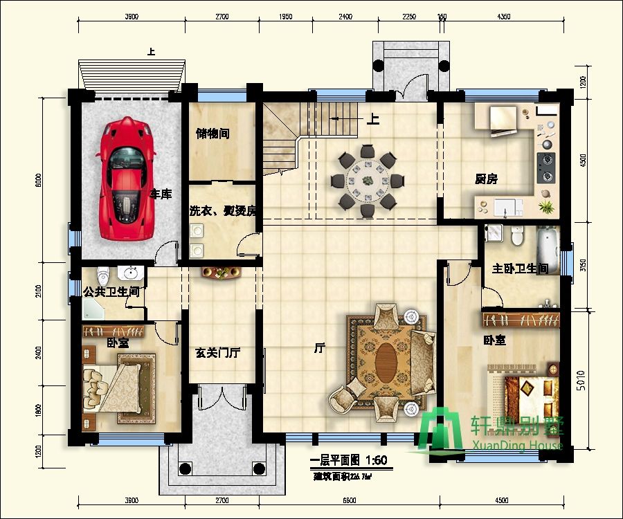 一層:車庫、門廳、客廳、廚房、餐廳、洗衣、儲物間、臥室、衛(wèi)生間、主臥(帶衛(wèi)生間)。