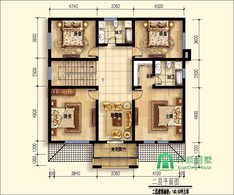 二層:臥室3、起居室、陽(yáng)臺(tái)、衛(wèi)生間、臥室(帶衛(wèi)生間)。