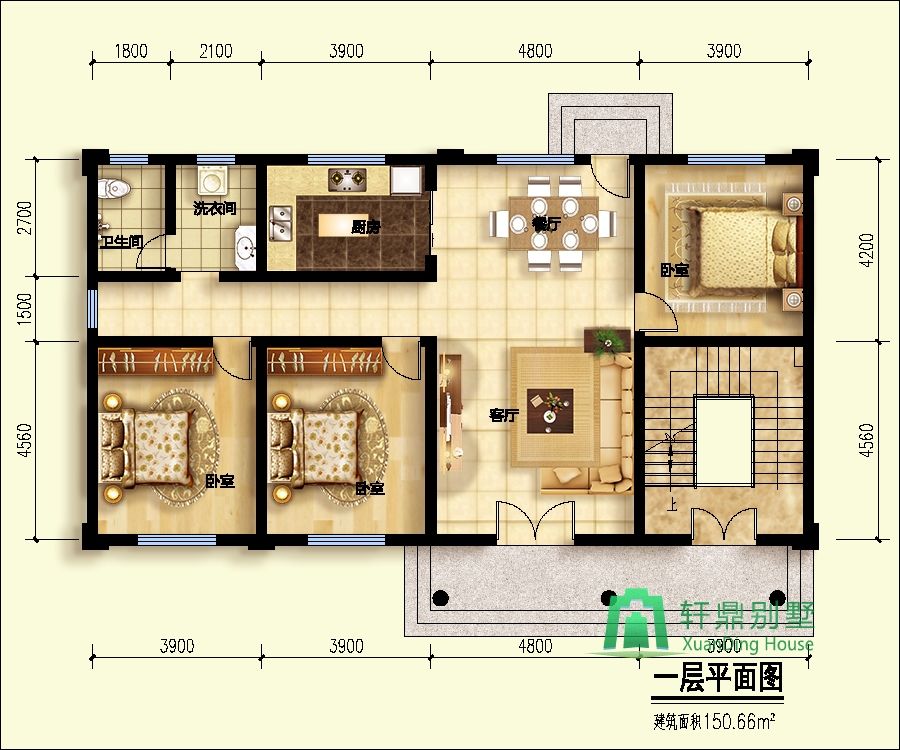 一層:客廳、廚房、餐廳、臥室3、衛(wèi)生間。
