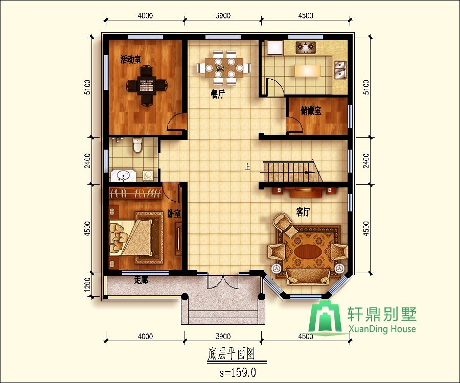 一層:客廳、廚房、餐廳、臥室、衛(wèi)生間、活動(dòng)廳、儲(chǔ)藏室。