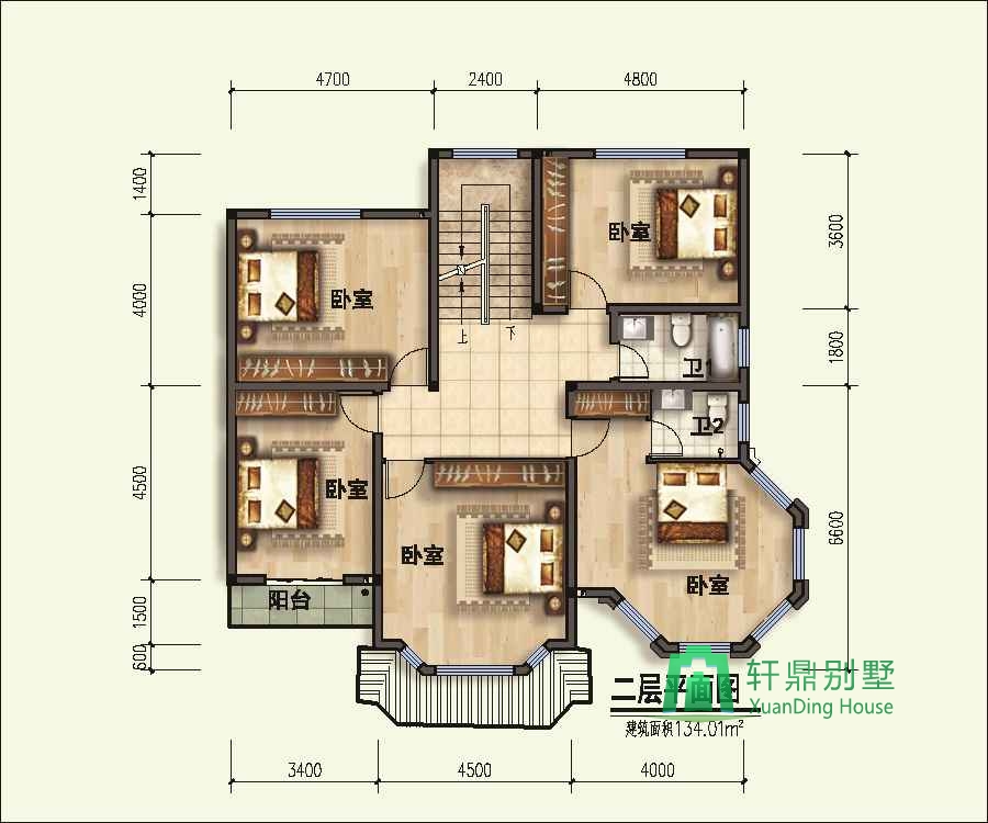 二層:臥室3、臥室(帶衛(wèi)生間)、臥室(帶陽臺)。