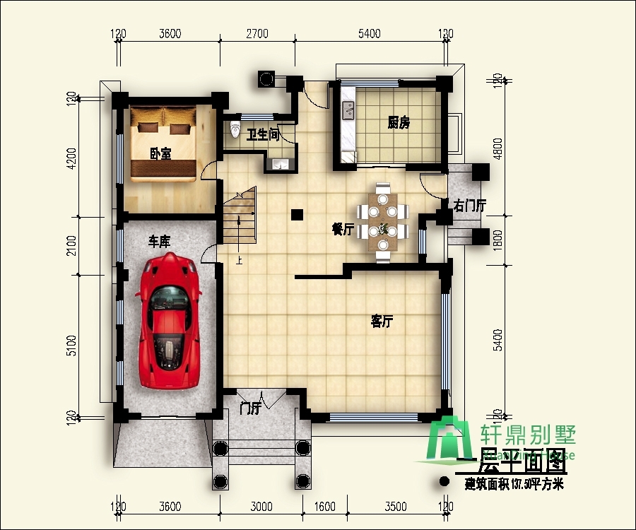 一層:門廳、客廳、廚房、餐廳、臥室、衛(wèi)生間、車庫(kù)。