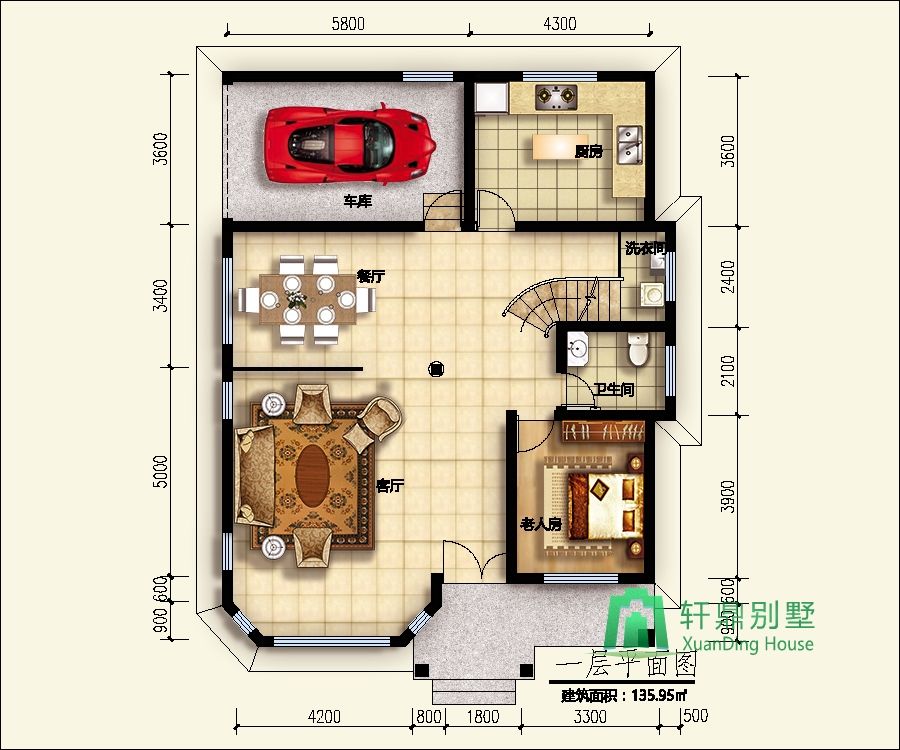 一層:車(chē)庫(kù)、客廳、廚房、餐廳、臥室、衛(wèi)生間、洗衣房。