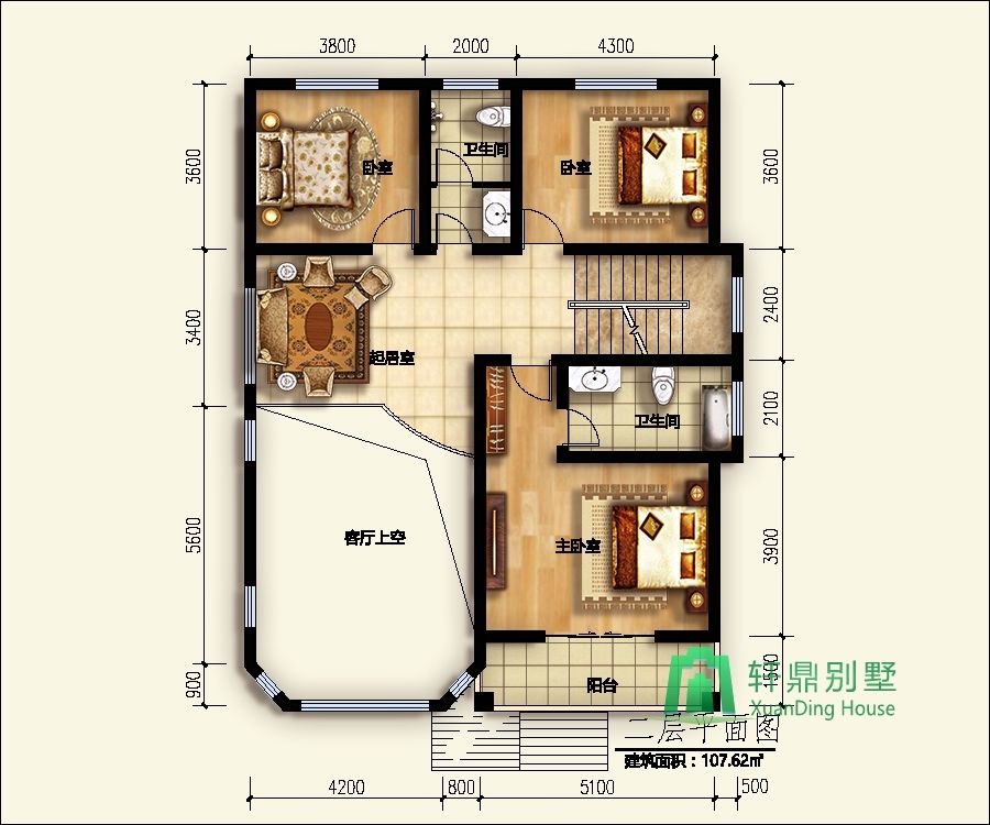 二層:起居室、臥室2、衛(wèi)生間、臥室(帶衛(wèi)生間、陽(yáng)臺(tái))。