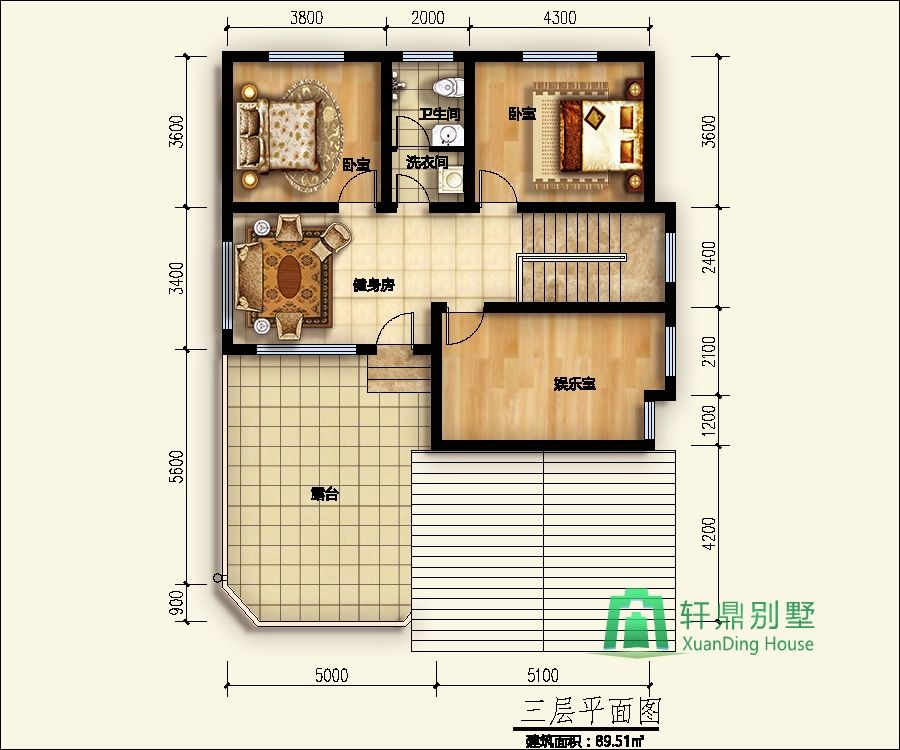 三層:臥室2、衛(wèi)生間、洗衣間、健身房、娛樂(lè)室、露臺(tái)。
