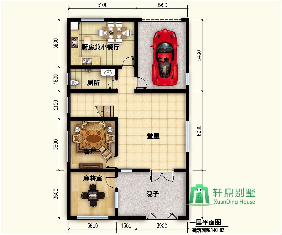 一層:院子,堂屋,車庫、客廳、麻將室、衛(wèi)生間、廚房兼餐廳。