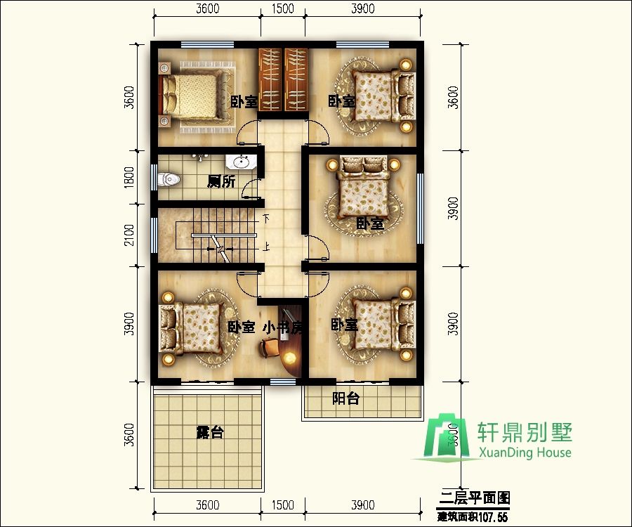二層:臥室3、衛(wèi)生間、臥室(帶陽臺)、臥室(帶書房、露臺)。