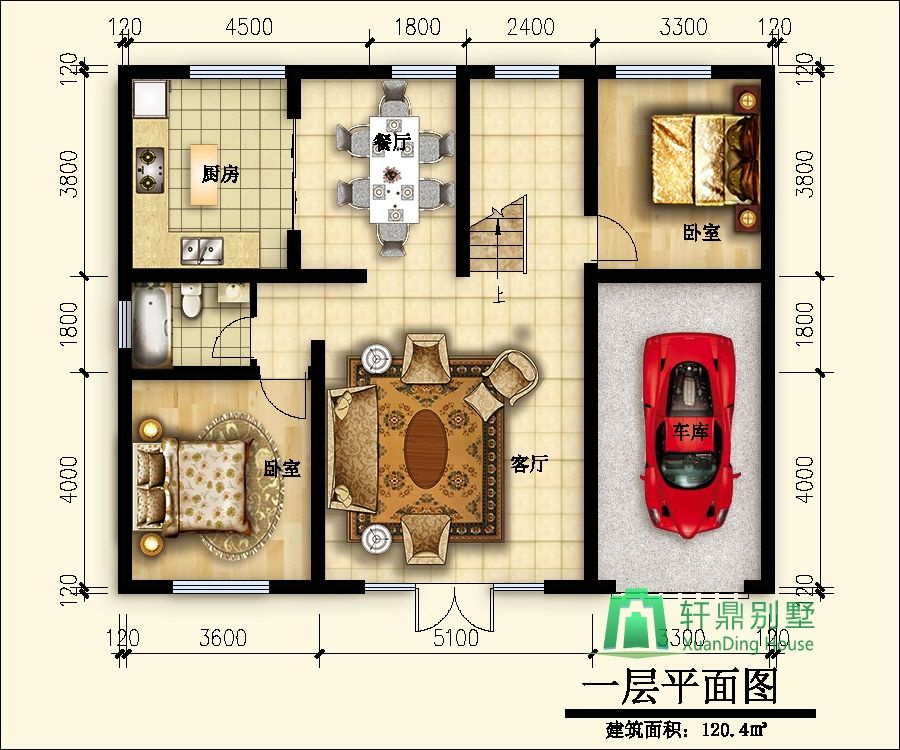 一層:客廳、廚房、餐廳、臥室2、衛(wèi)生間、車庫(kù)。