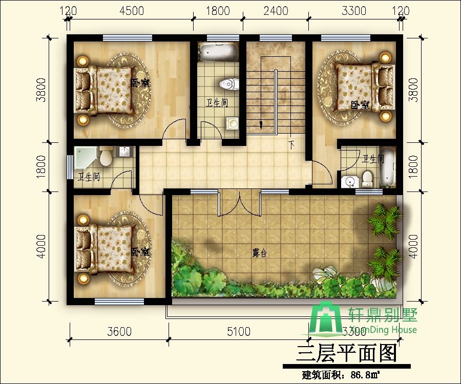 三層:臥室、衛(wèi)生間、露臺(tái)、臥室2(帶衛(wèi)生間)。