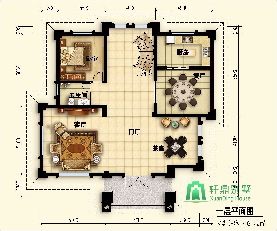 一層:門廳、客廳、廚房、餐廳、茶室、臥室、衛(wèi)生間。