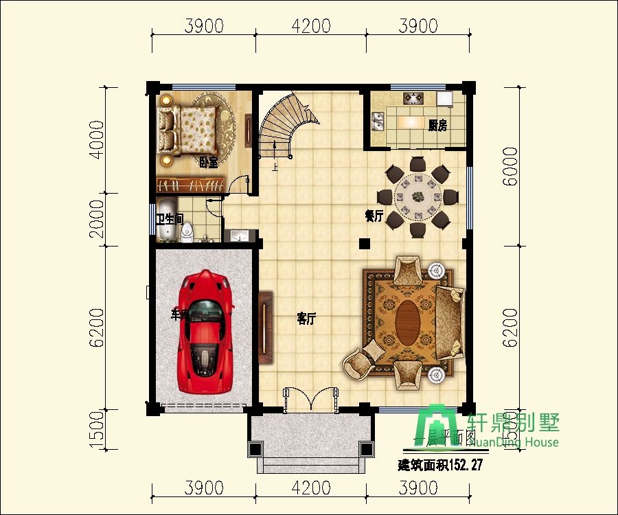 一層:客廳、廚房、餐廳、衛(wèi)生間、臥室、車庫。