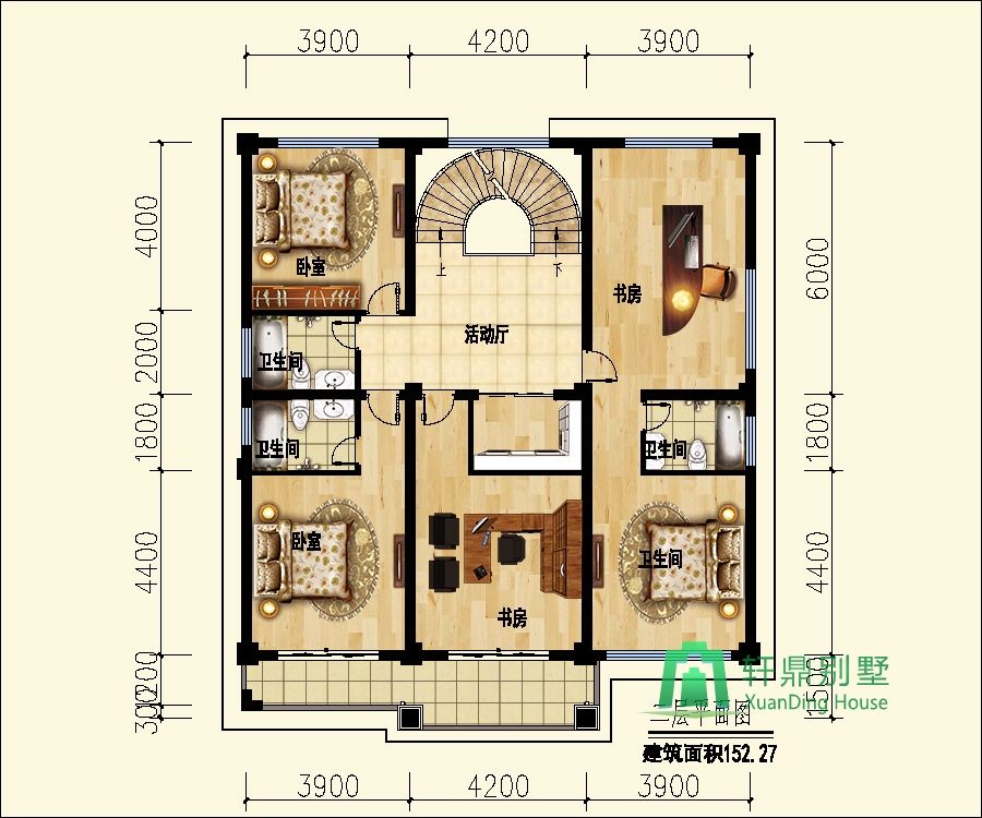 二層:臥室、衛(wèi)生間、臥室(帶陽臺、衛(wèi)生間)、臥室(帶書房、衛(wèi)生間)、書房(帶陽臺)。