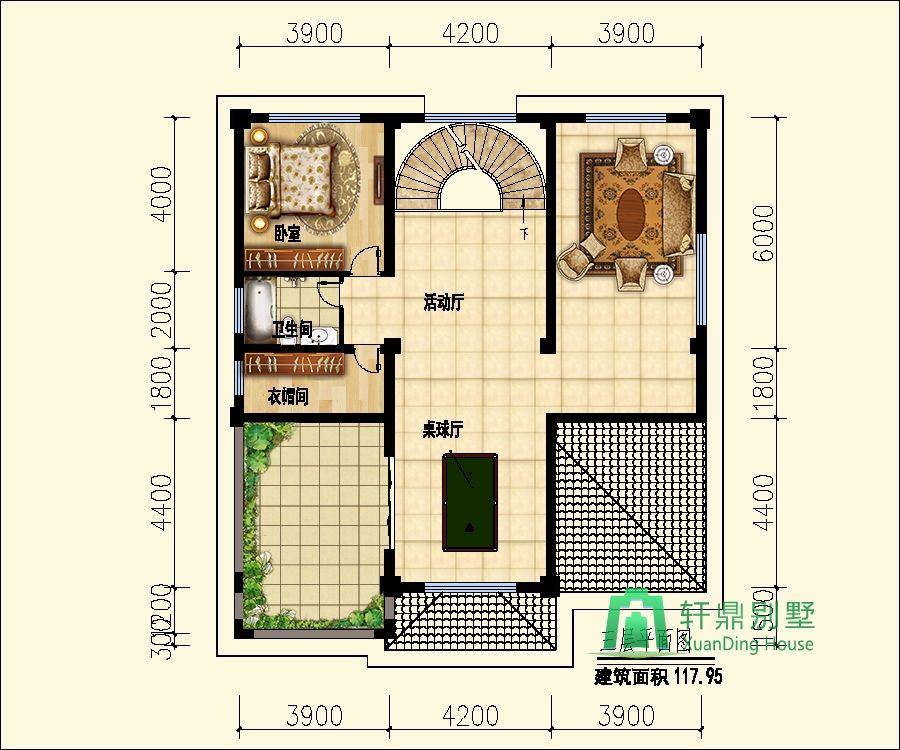 三層:活動廳、露臺、衣帽間、臥室、衛(wèi)生間。