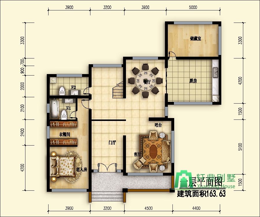 一層:門廳、客廳、廚房、餐廳、儲藏室、衛(wèi)生間、臥室(帶衣帽間衛(wèi)生間)。