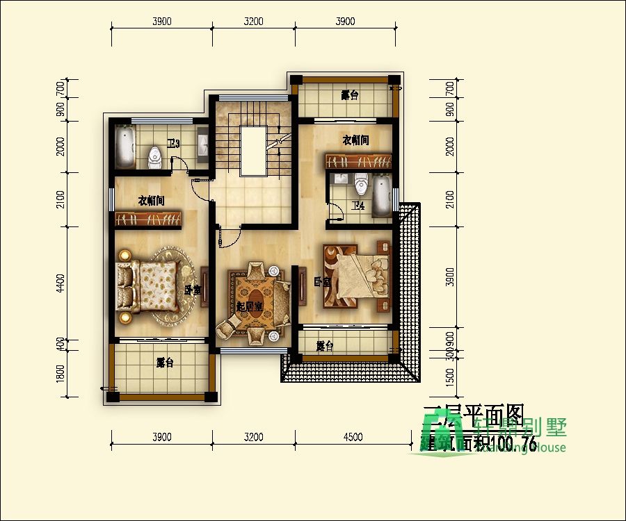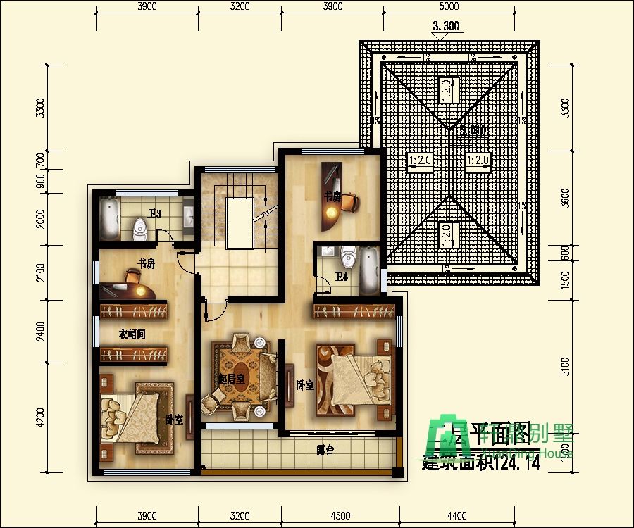 二層:臥室(帶衣帽間、書房、衛(wèi)生間)、臥室(帶書房、起居室、衛(wèi)生間、露臺)。