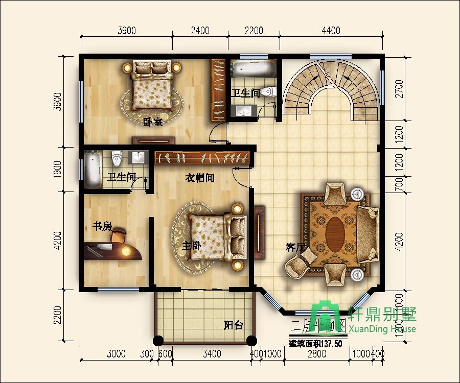二層:客廳、臥室、衛(wèi)生間、臥室(帶陽臺、書房、衣帽間、衛(wèi)生間)。