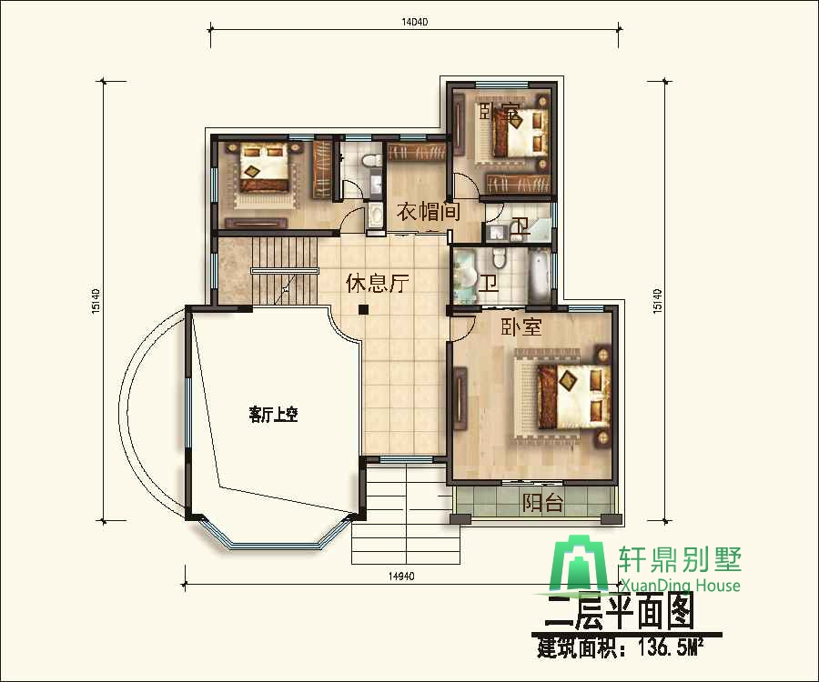 二層:休息廳、臥室(帶衛(wèi)生間)、臥室(帶衣帽間、衛(wèi)生間)、臥室(帶衛(wèi)生間、陽臺)。