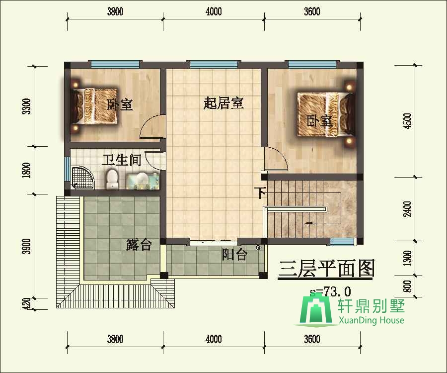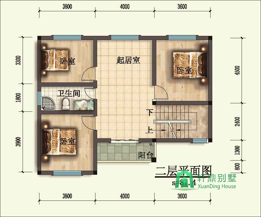 二層:臥室3、起居室、衛(wèi)生間、陽臺(tái)。