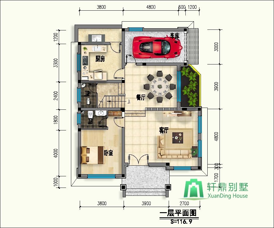 一層:客廳、廚房、餐廳、衛(wèi)生間、車庫(kù)、臥室(帶衛(wèi)生間)。