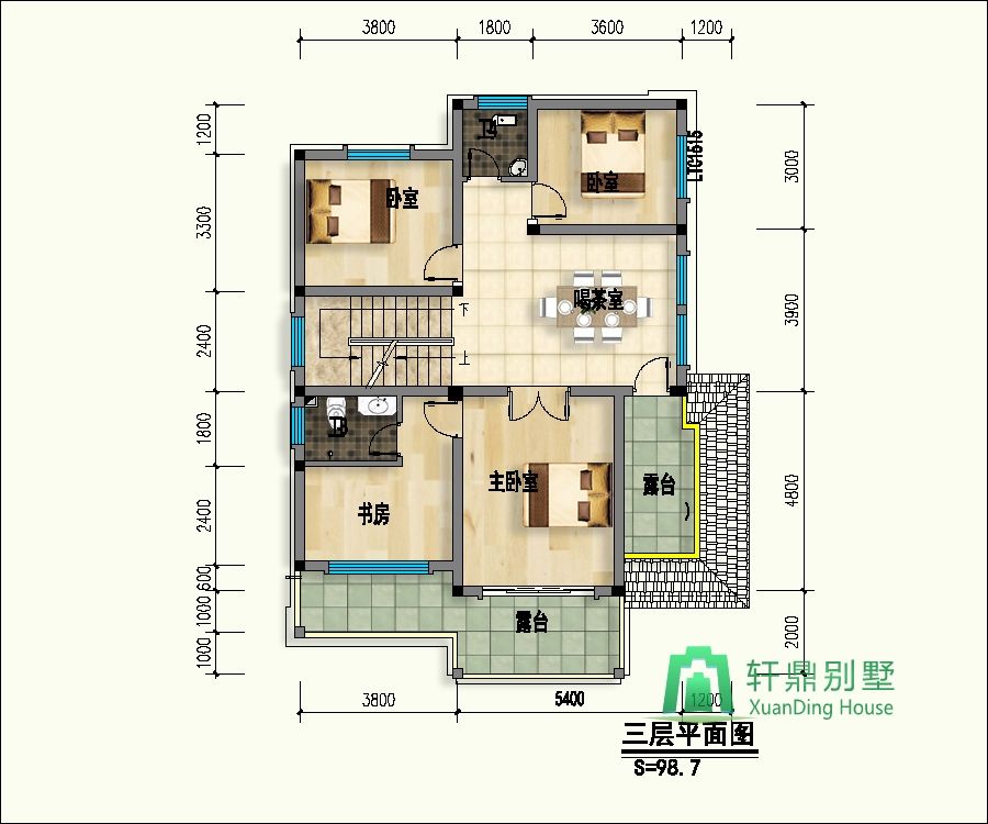 三層:臥室2、喝茶室、衛(wèi)生間、露臺(tái)、臥室(帶書(shū)房、衛(wèi)生間、露臺(tái))。