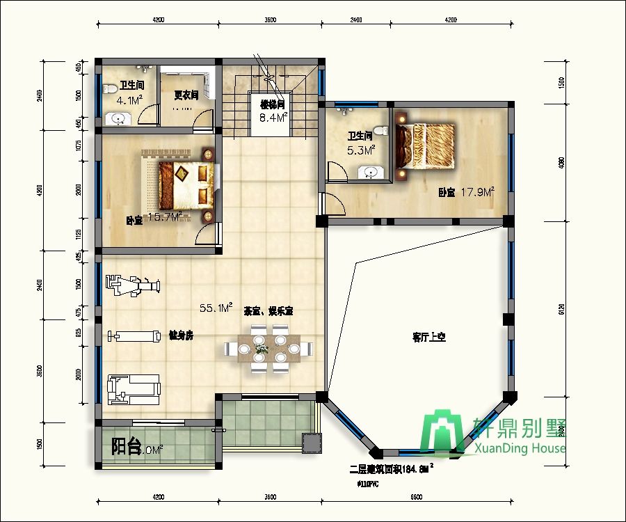 二層:茶室、健身房、陽(yáng)臺(tái)、臥室(帶衛(wèi)生間)、臥室(帶衣帽間、衛(wèi)生間)。