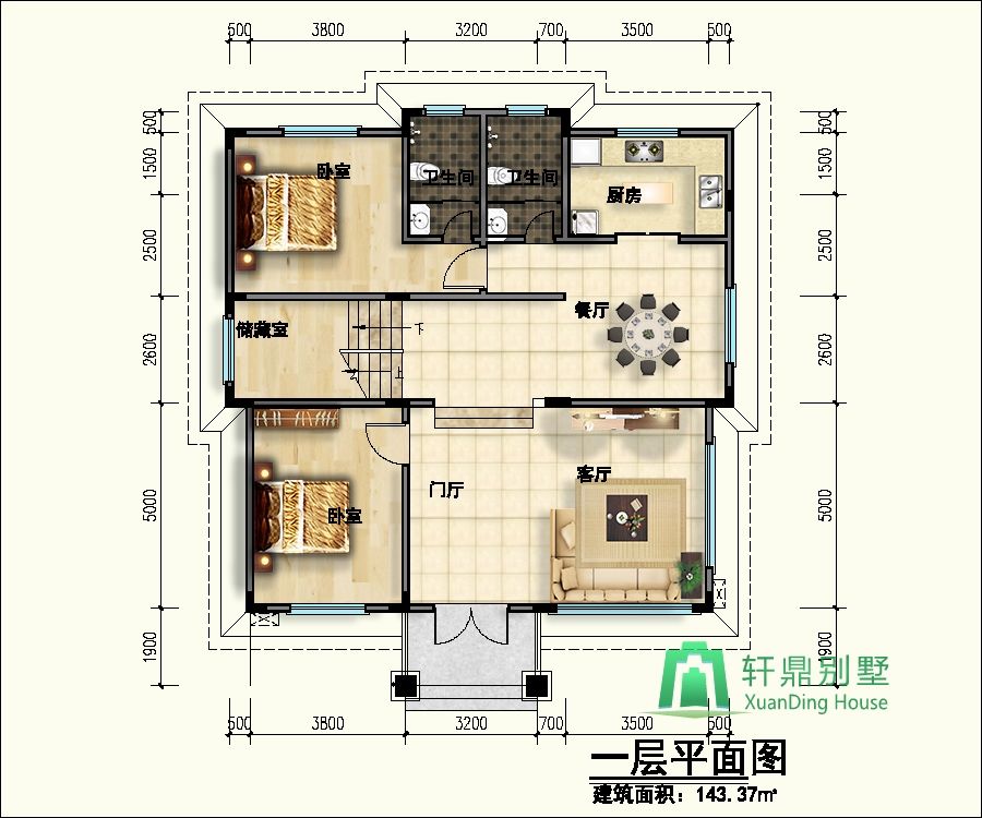 一層:門廳、客廳、廚房、餐廳、儲藏室、臥室、衛(wèi)生間、臥室(帶衛(wèi)生間)。