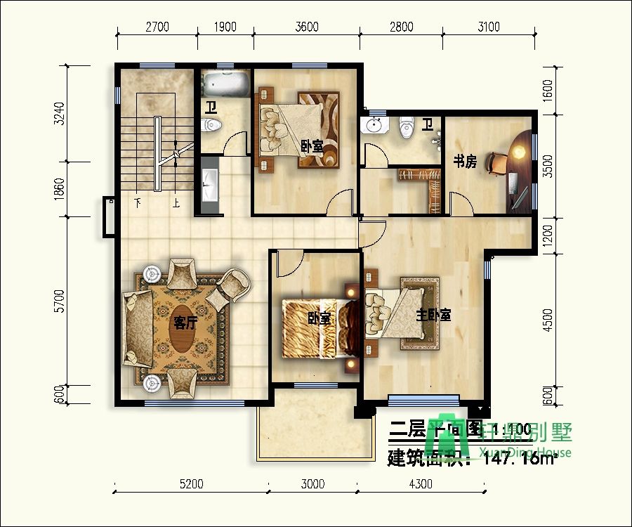 二層:客廳、臥室(帶陽臺(tái))、臥室、衛(wèi)生間、臥室(帶更衣室、衛(wèi)生間、書房)。