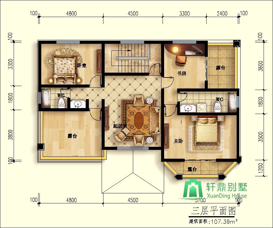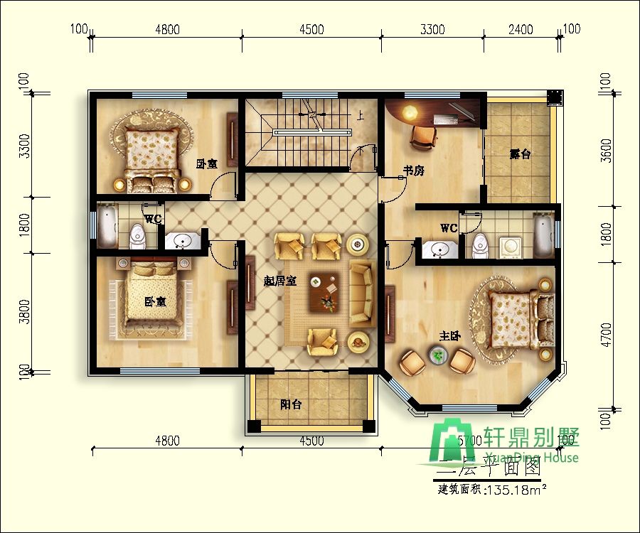 二層:臥室2、衛(wèi)生間、起居室、陽臺、臥室(帶書房、露臺、衛(wèi)生間)。