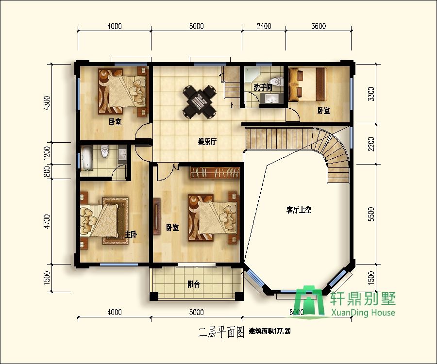 二層:娛樂廳、臥室(帶衛(wèi)生間)、臥室(帶陽臺(tái))、臥室2、衛(wèi)生間。