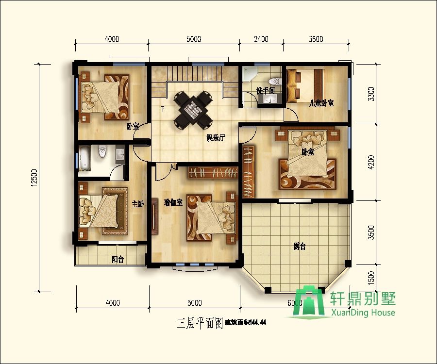 三層:臥室(帶陽臺(tái)、衛(wèi)生間)、娛樂廳、瑜伽室、臥室2、衛(wèi)生間、臥室(帶露臺(tái))。