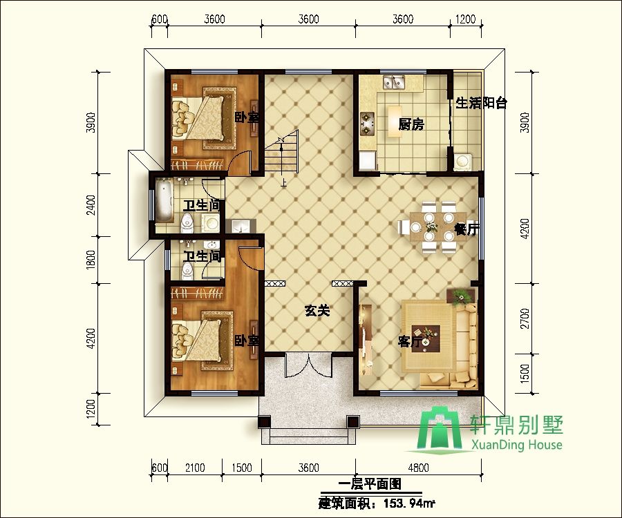 一層:玄關、客廳、廚房、餐廳、生活陽臺、臥室、衛(wèi)生間、臥室(帶衛(wèi)生間)。
