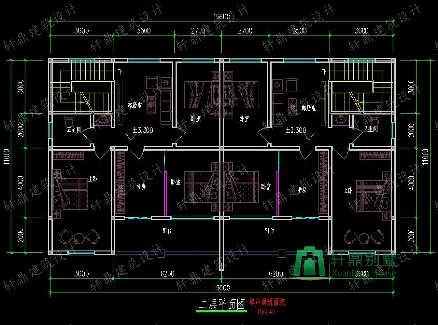二層:單戶(起居室、臥室、衛(wèi)生間、臥室(帶書房、陽臺))