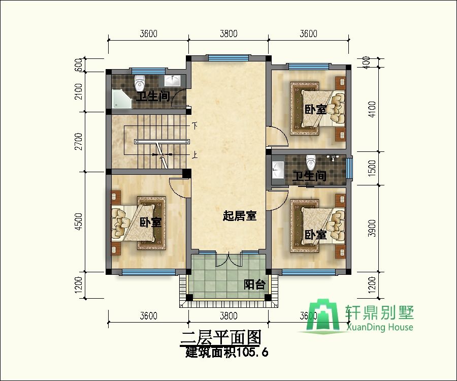 二層:起居室、陽(yáng)臺(tái)、臥室2、衛(wèi)生間、臥室(帶衛(wèi)生間)。