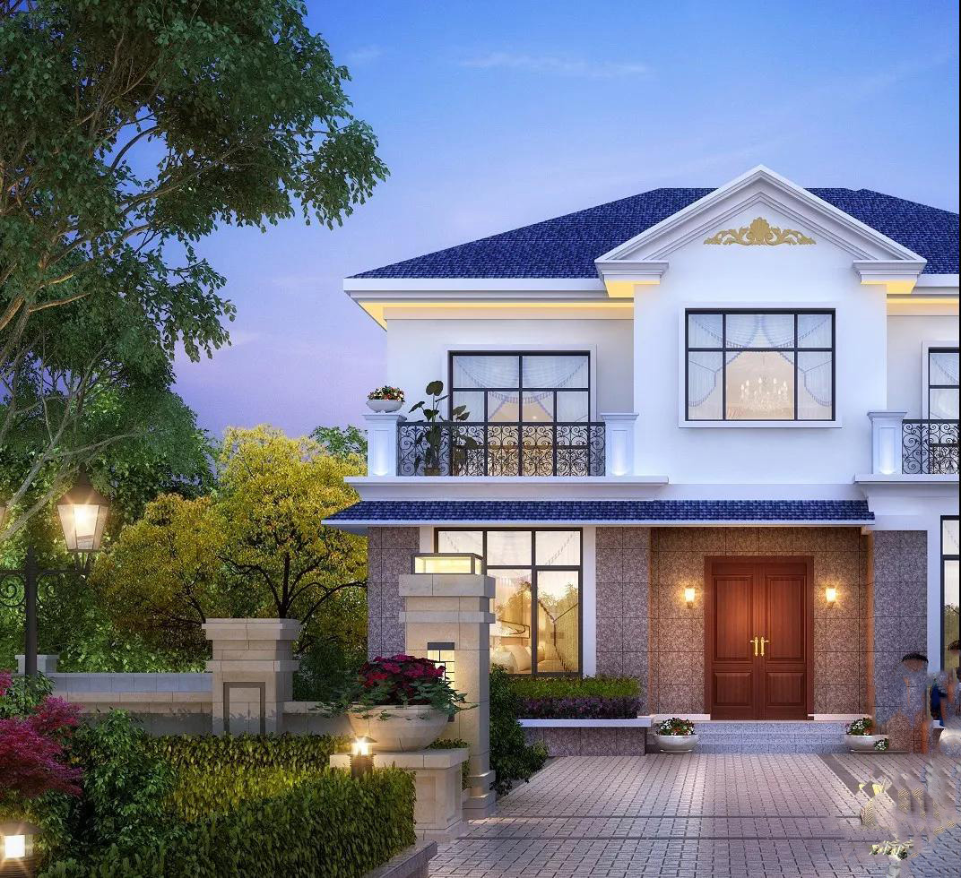別墅外墻用白色和咖灰色真石漆搭配裝飾,藍(lán)色波形瓦清新靚麗,精美花紋鐵藝欄桿和金色山花點(diǎn)綴,巧妙的搭配,使別墅更貼合鄉(xiāng)村美麗風(fēng)景。