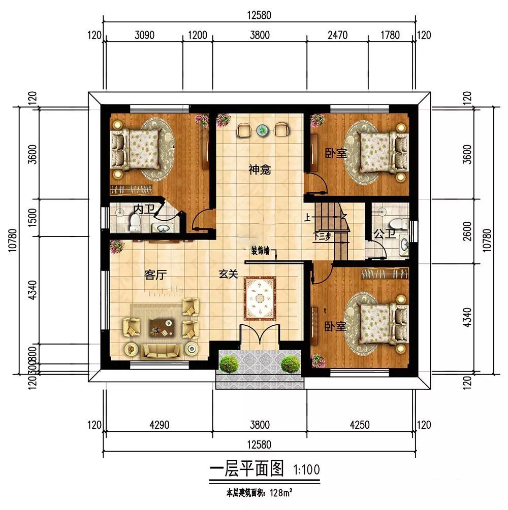 一層:入戶設(shè)玄關(guān)隔斷,神龕堂屋,符合當(dāng)?shù)剜l(xiāng)村生活習(xí)俗;廚房餐廳單獨(dú)在院子里建造,隔離油煙;3個臥室2個衛(wèi)生間,布局合理,家人居住舒適。