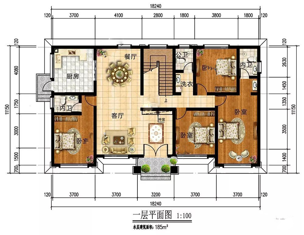 一層:入戶設(shè)神位,符合風(fēng)水民俗;客廳寬敞,待客周到方便;4個(gè)臥室,居住便利舒適;廚房餐廳在后,設(shè)側(cè)門(mén),用餐干凈衛(wèi)生。
