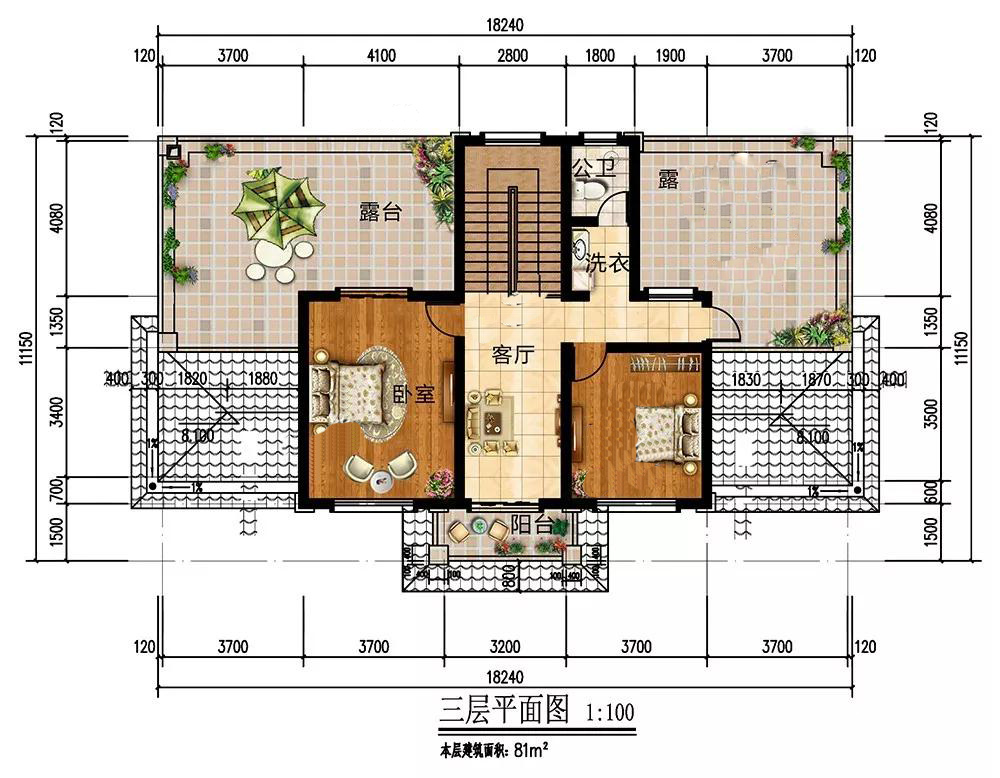 三層:客廳陽(yáng)臺(tái)連通,增強(qiáng)室內(nèi)采光;2個(gè)臥室,居住有余可以用來(lái)留宿客人;2個(gè)寬闊的露臺(tái),觀景角度好,家人也可在此看書(shū)喝茶,愜意舒適