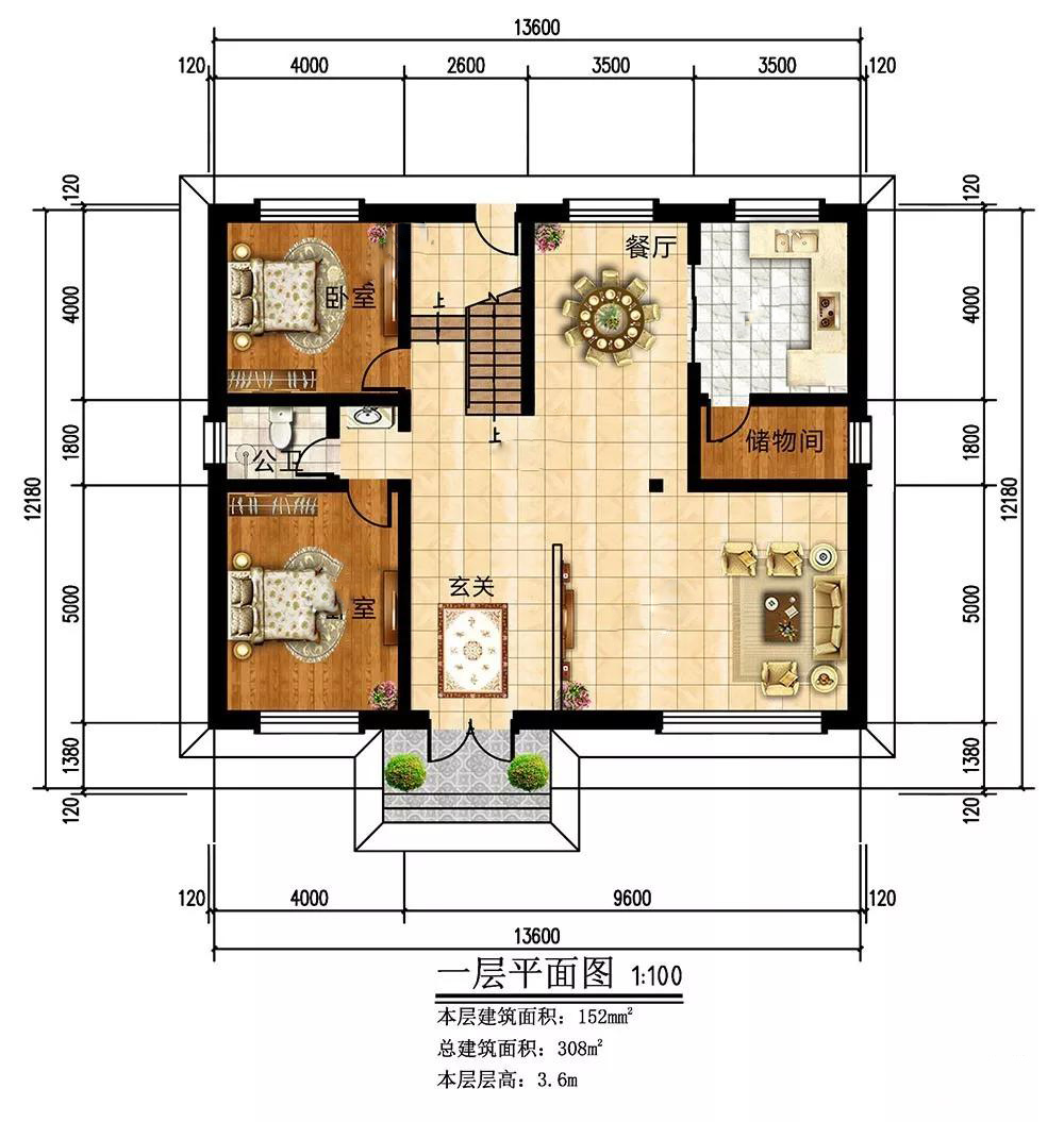 一層:入戶玄關(guān)隔斷,避免進門見樓梯;客廳寬闊,家人活動空間大;2個臥室,離公衛(wèi)近,方便老人起居;半開放式餐廳廚房,上菜方便,用餐愉快。