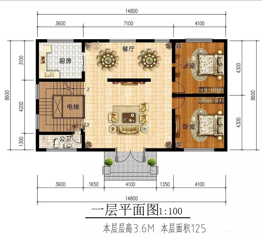 一層:入戶客廳寬闊,待客倍有面子;2個臥室,大小適中,家人居住舒適;廚房餐廳寬闊,方便過年時家庭聚餐;設電梯,上下樓方便。